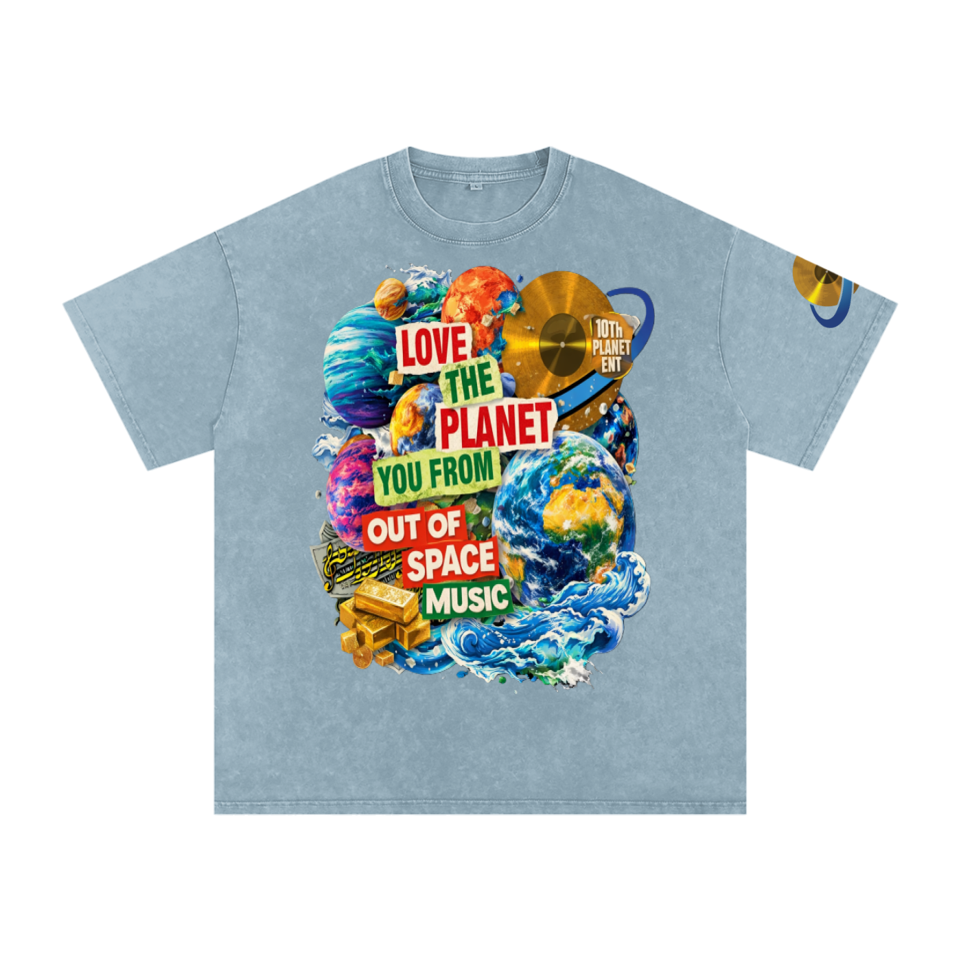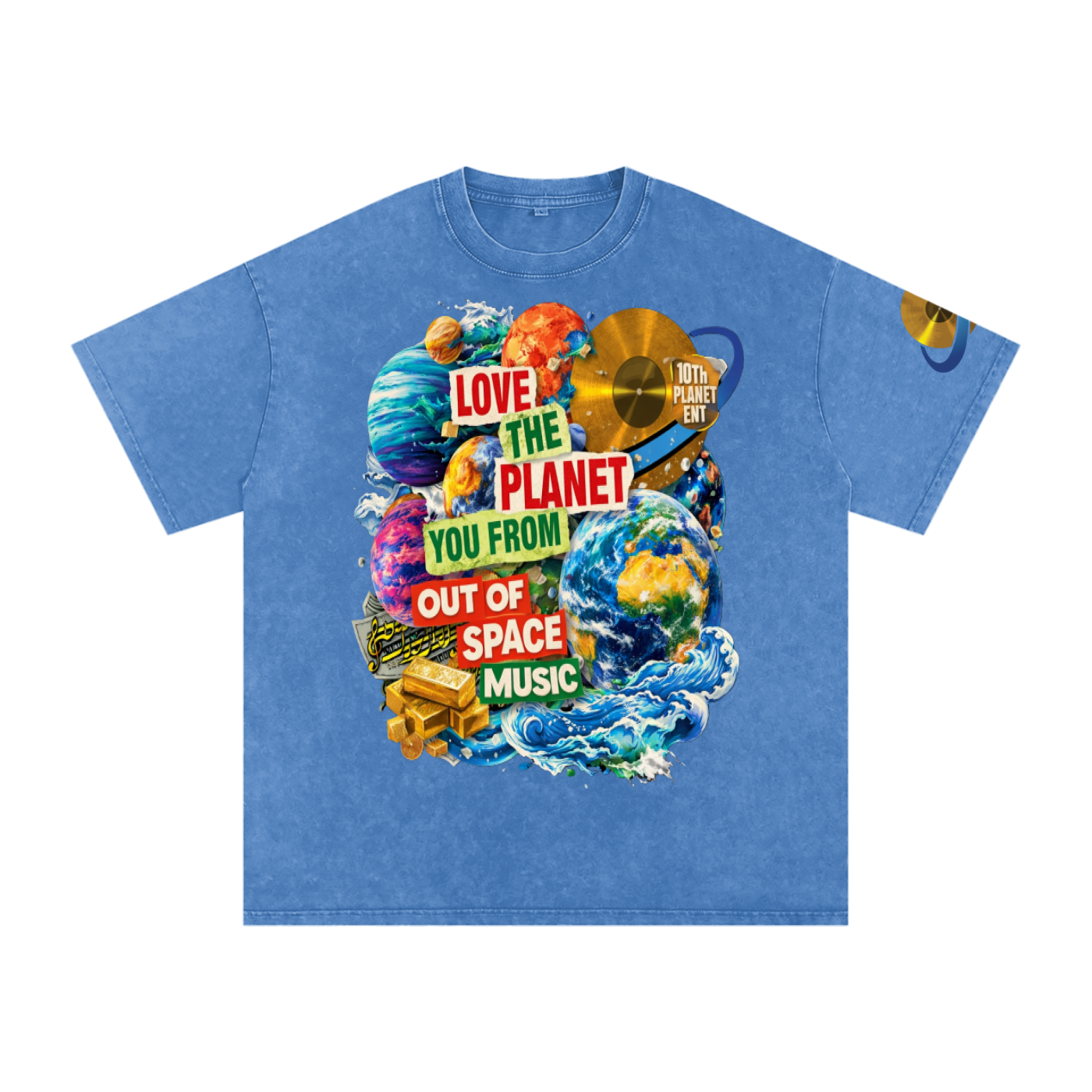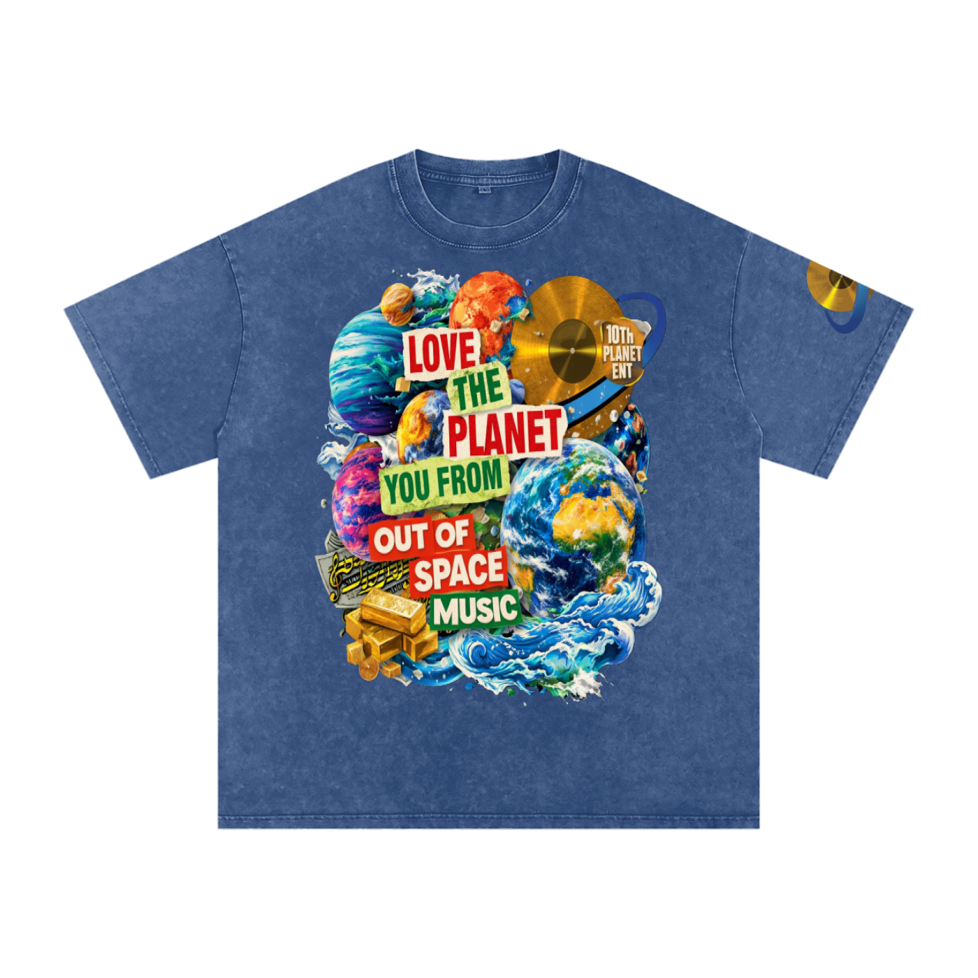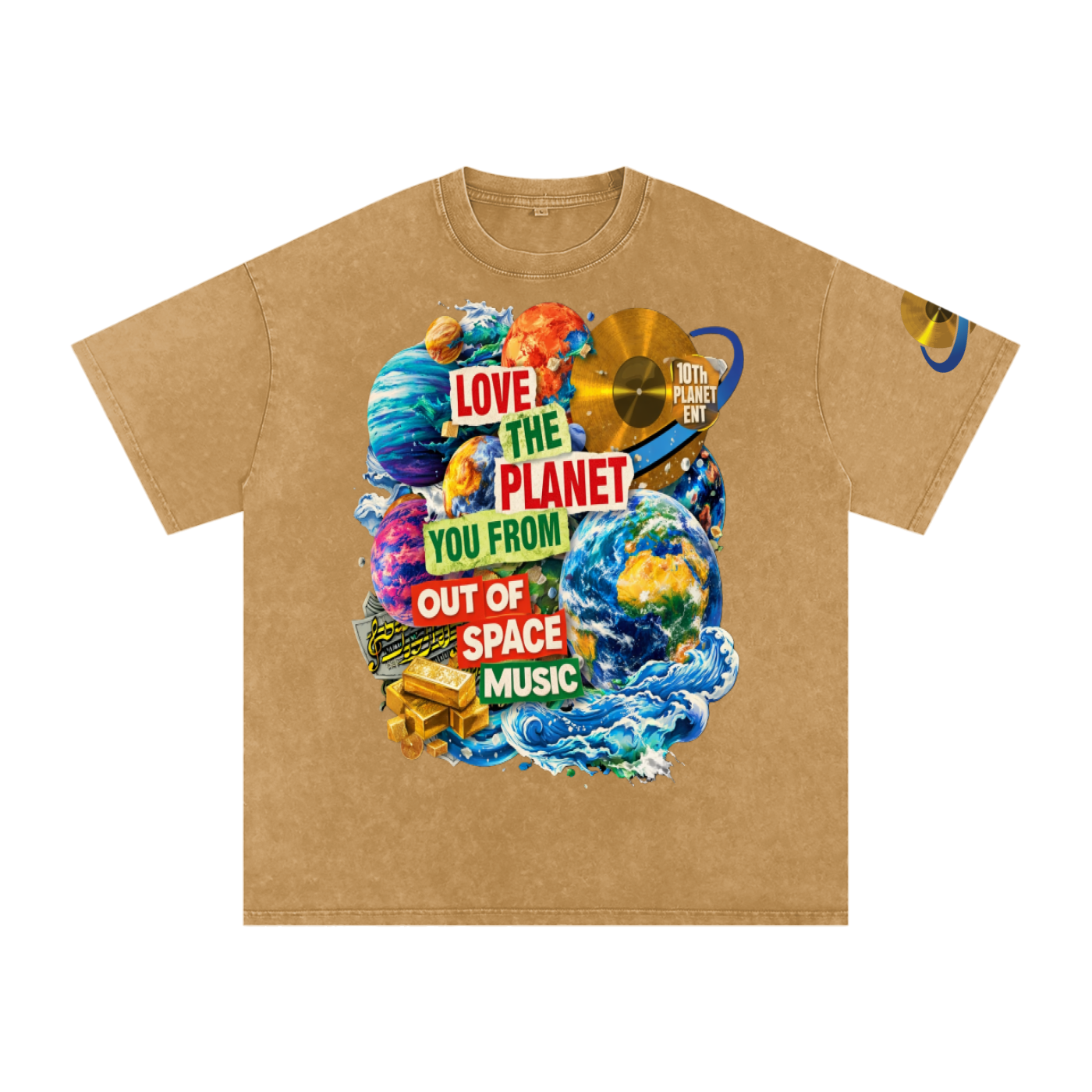 The Love Your Planet – Out of Space Music Tee from 10th Planet Ent. blends music, identity, and cosmic energy into one bold streetwear piece. Featuring a gold disk orbit logo surrounded by planetary and earth elements, it carries the message “love the planet you from” and “out of space music.”