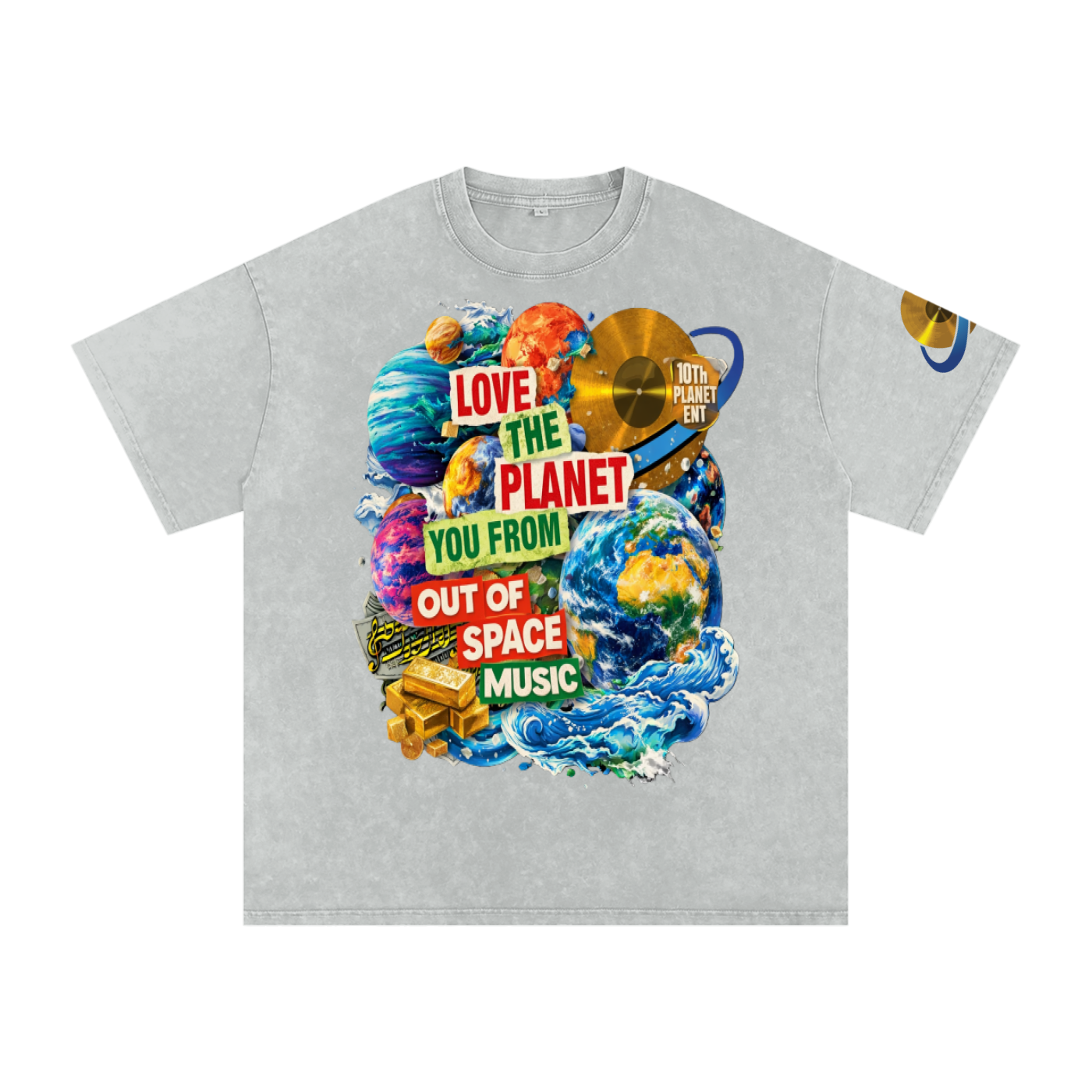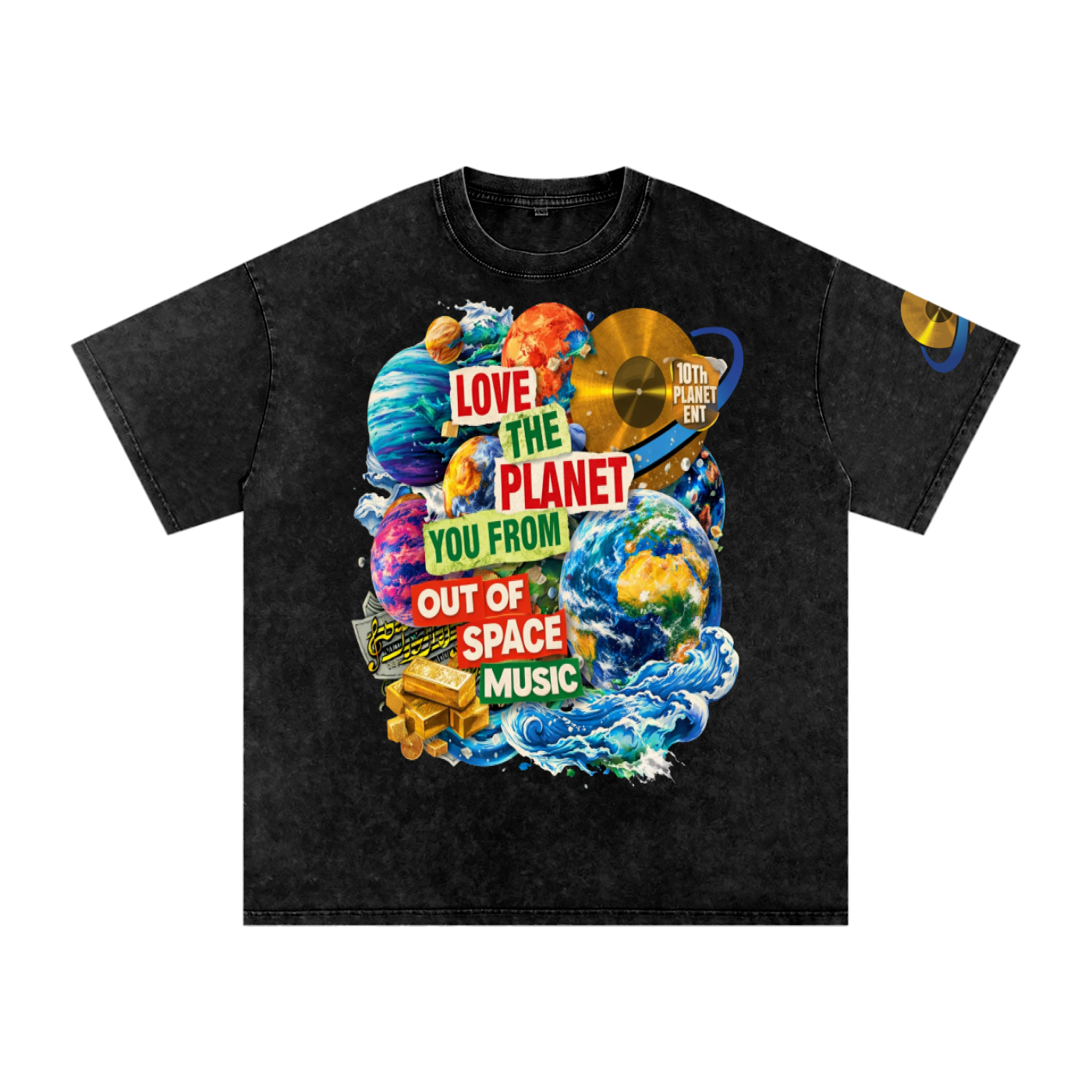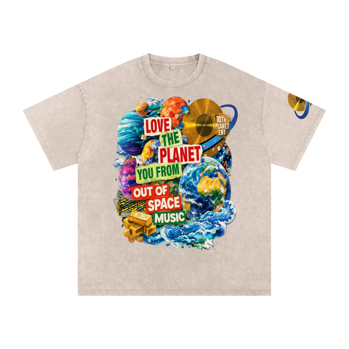The Love Your Planet – Out of Space Music Tee from 10th Planet Ent. blends music, identity, and cosmic energy into one bold streetwear piece. Featuring a gold disk orbit logo surrounded by planetary and earth elements, it carries the message “love the planet you from” and “out of space music.”